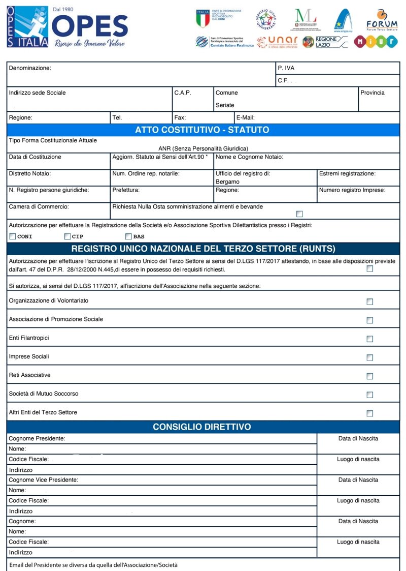 Affiliazione all'Ente di Promozione Sportiva OPES ITALIA e affiliazione al Coni e al Registro Sport e Salute